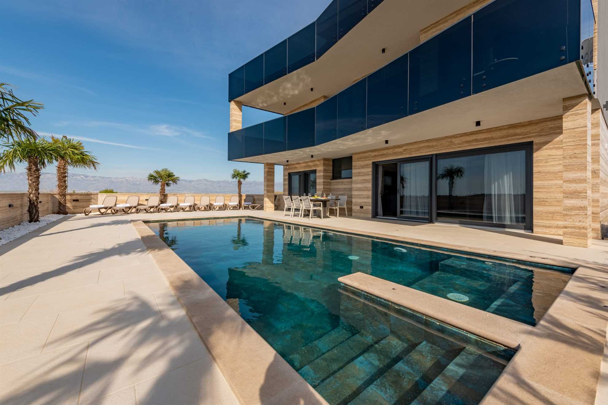 K dispozícii je súkromný vyhrievaný bazén (40 m2, hĺbka 150 cm) so sprchovacím kútom a priestorom na opaľovanie s ležadlami.
