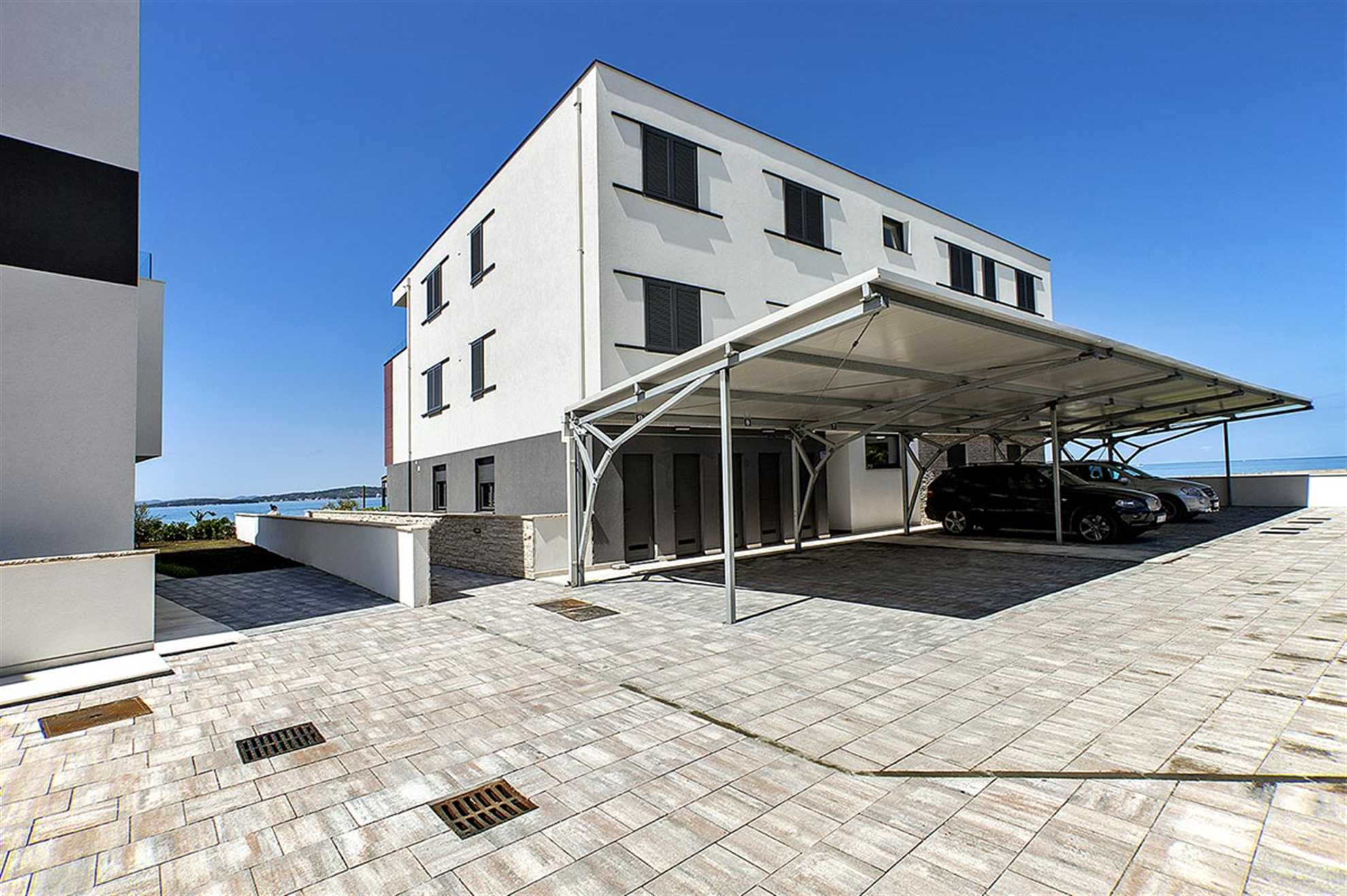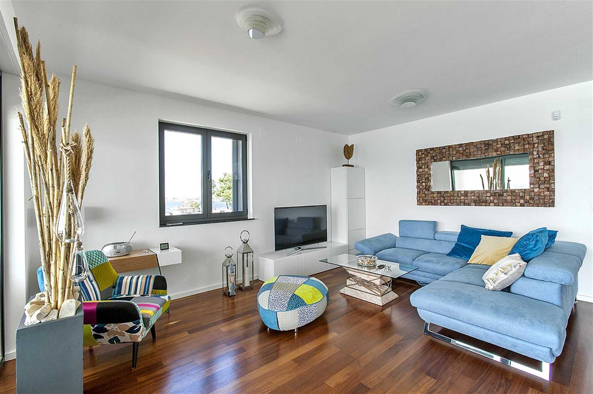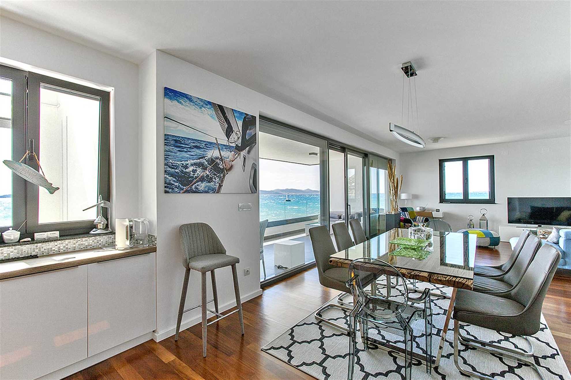 Pohodlný, moderní apartmán na pláži s panoramatickým výhledem na moře v Sukošanu. Nabízí soukromou a plně vybavenou sluneční terasu na pláži.
