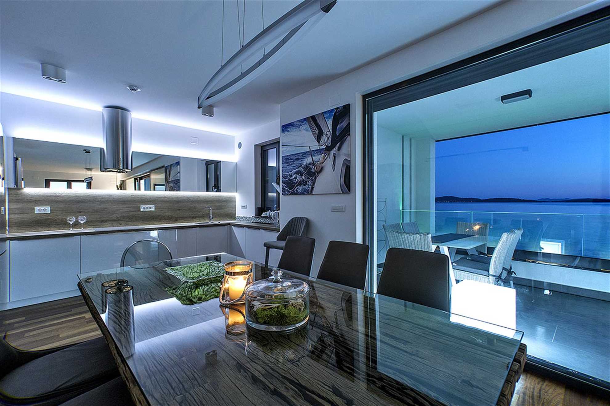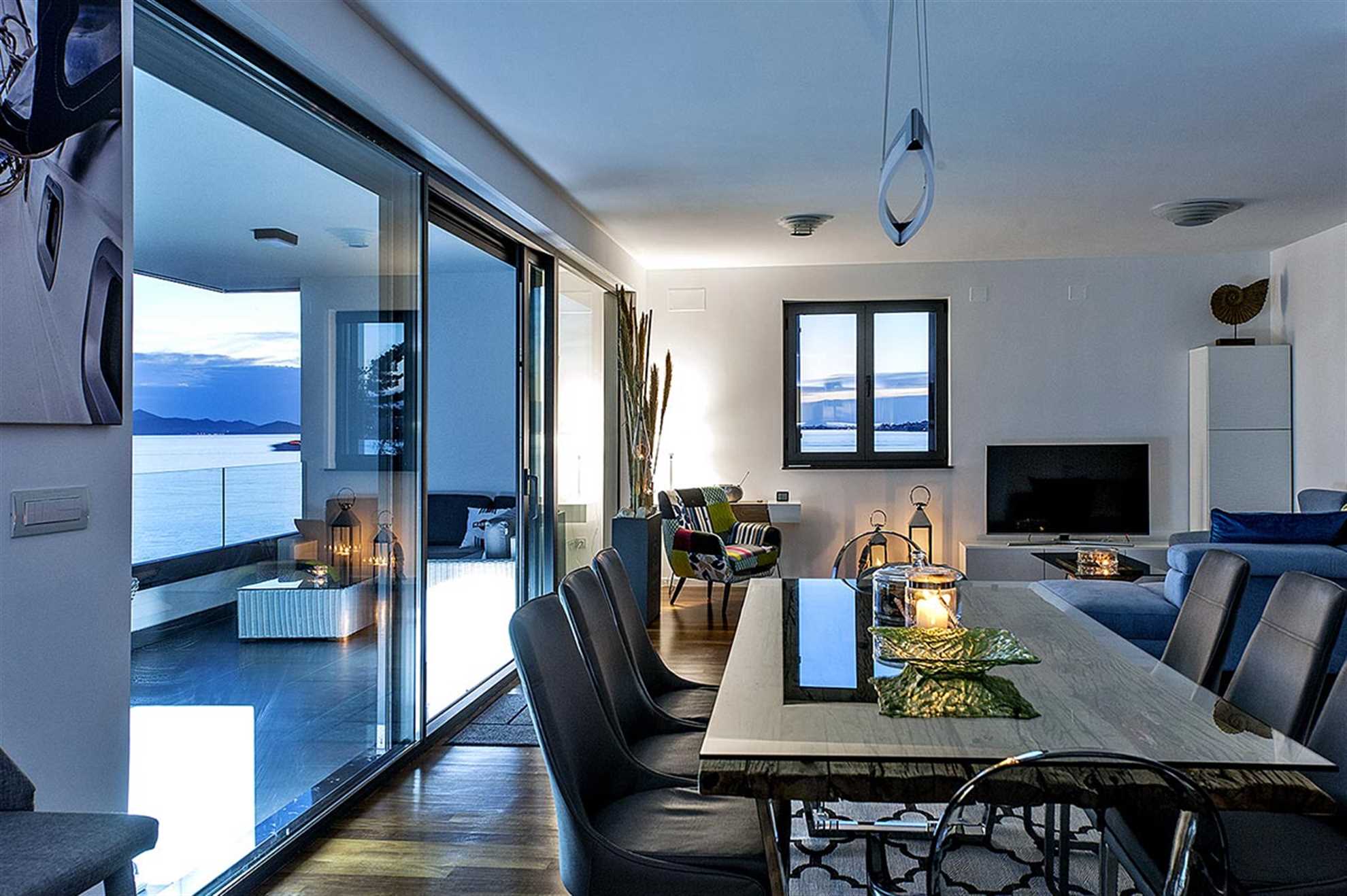 Prosluněný, klimatizovaný obývací pokoj propojený s plně vybavenou kuchyní a jídelnou s velkým stolem a židlemi má přímý vstup na zastřešenou terasu 22m2 . Stěna obývacího pokoje, prosklená po celé výšce, je posuvná, čímž se propojuje s lodžií a zpřístupňuje nádherný panoramatický výhled na moře a ostrovy nejen z terasy, ale i z pokoje. Na balkoně je jídelní stůl a set obývacího nábytku.
