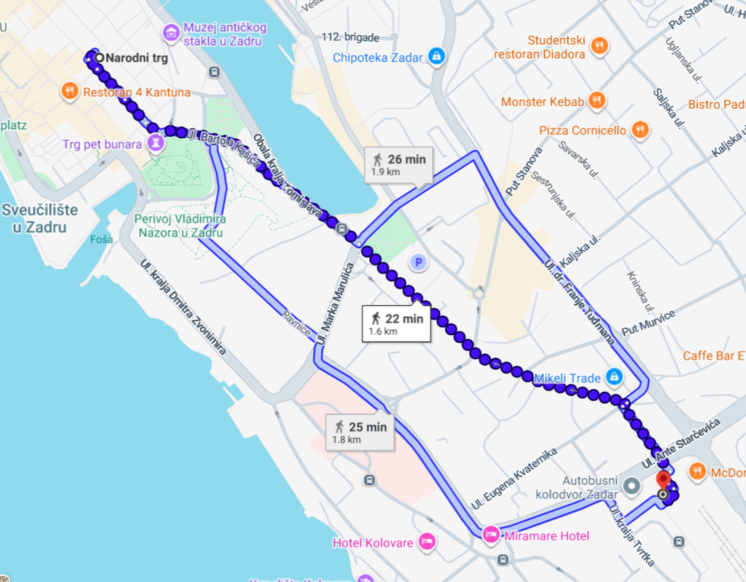 Tu znajdziesz przekierowanie do rozkładów jazdy autobusów z i na zadarski dworzec autobusowy. UWAGA: autobus z lotnisa dociera tylko do dworca głównego. Centrum Zadaru (Poluotok), oddalone jest niecałe 2 km. W google maps wpisz Narodni Trg, a dotrzesz do ścisłego cetrum.